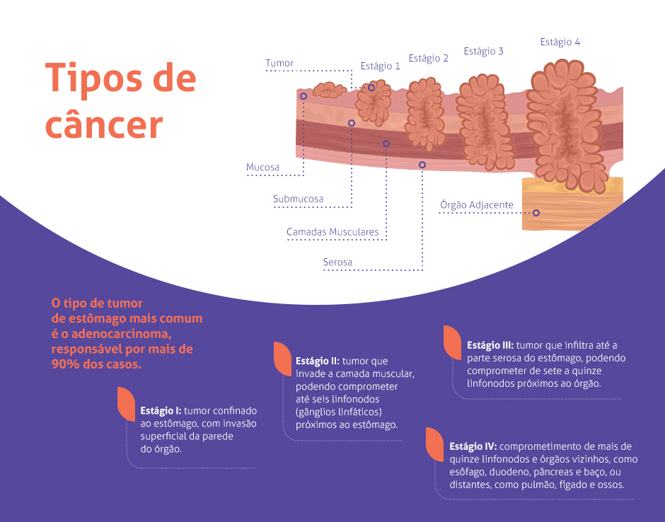 O tipo de tumor de estômago mais comum é o adenocarcinoma, responsável por mais de 90% dos casos. Ele se origina na camada da mucosa, isto é, na parte mais interna do estômago, que fica em contato direto com os alimentos.